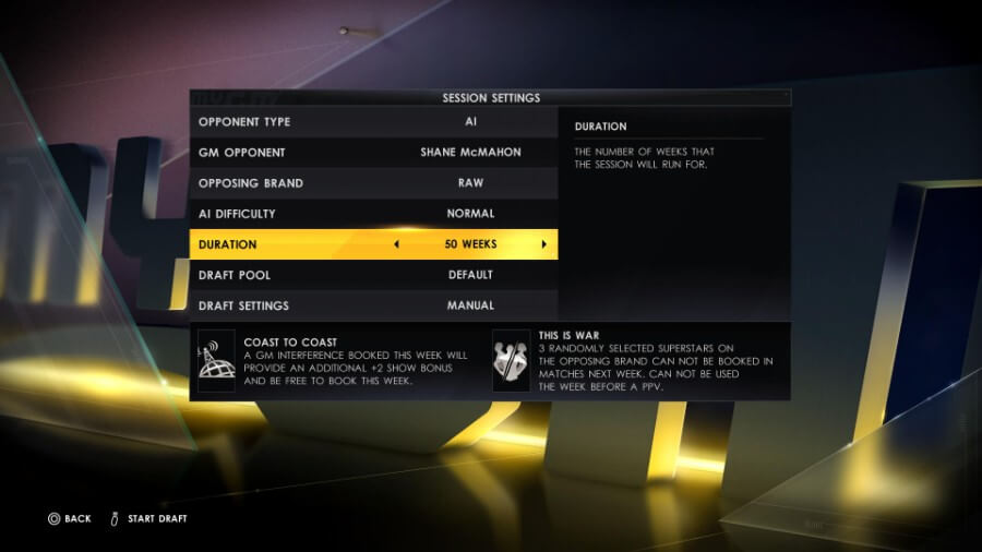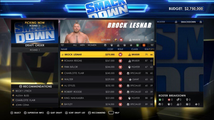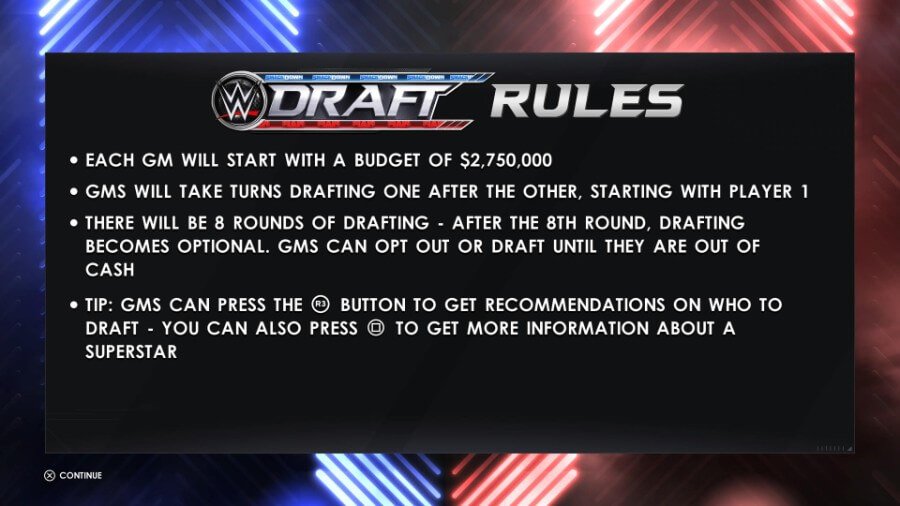 초안은 8개의 필수 라운드. 8라운드 이후에는 275만 달러의 할당된 풀로 드래프트를 계속할 수 있습니다. 각 레슬러는 고려해야 할 가격, 스타일, 정렬, 체력 및 인기가 있습니다. 운 좋게도 선택한 쇼에 관계없이 항상 첫 번째 선택을 받고 대체 선택을 받게 됩니다. 즉, 항상 각 라운드의 첫 번째 선택 항목이 있습니다.