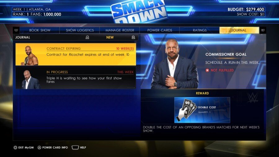 마지막 쇼를 제외하고 Triple H의 저널에 주간 커미셔너의 목표가 있습니다. 여기에는 런 인 일정 잡기, 테이블 매치, 가장 인기 있는 얼굴을 가장 인기 있는 힐에 맞추는 것 등 무엇이든 될 수 있습니다. 그만큼 이러한 작업을 수행하는 데 대한 보상은 파워 카드입니다. (아래에서 자세히), 따라서 보상은 특히 무료 물류 비용 카드인 경우 가치가 있습니다.