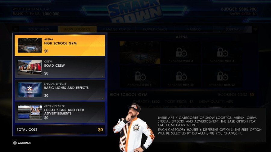 그런 다음 물류도 예약해야 합니다. 여기에는 특수 효과, 승무원, 광고 및 경기장이 포함됩니다. 특정 요구 사항을 충족하는 경우 각각에는 관련 비용과 선택적 부스트가 있습니다. 비용이 들지 않지만 긍정적인 수익이 거의 없는 각 범주의 기본부터 시작합니다. 다른 옵션은 몇 주 후에 열리며, 대부분은 쇼에 사용하는 데 돈을 쓰기 전에 잠금 해제를 위해 구매해야 합니다. 매주는 완전히 새로운 한 주이며 사용 가능한 예산에 따라 결정을 내려야 합니다.