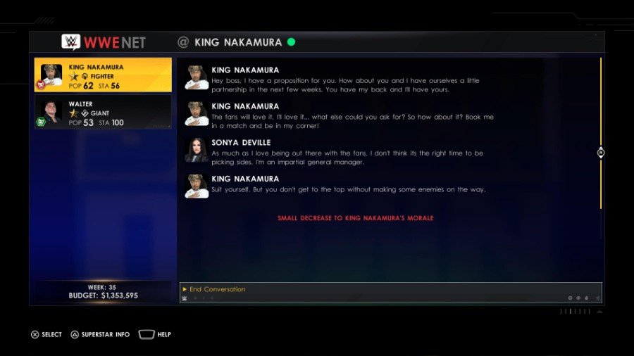 특정 요청이 있는 레슬러로부터 메시지를 받을 수도 있습니다. 레슬러에 관계없이 요청을 거부하면 결과가 나타납니다. 그 레슬러에 대한 사기 저하. 그들의 요구에 응하고, 가장 중요한 것은, 요청에 따라 결과는 그 레슬링 선수의 사기 증진. 때때로, 당신이 한동안 레슬러를 사용하지 않았다면, 그들은 10만 달러의 보너스를 요구하다 쇼에 남아 있기 위해. 일부는 거부할 수 있으며 일부는 “한 번 더” 기회를 제공하는 반면 다른 일부는 완전히 떠날 것입니다.