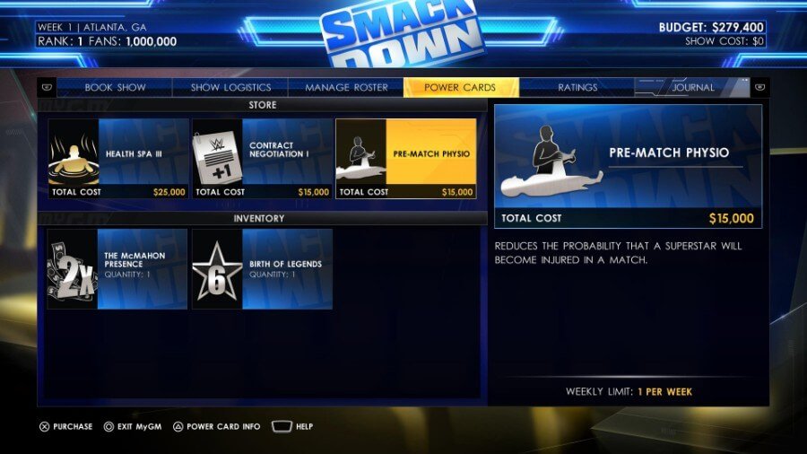 마지막으로 파워카드를 구매하여 사용할 수 있습니다. 매주 세 가지 제안을 확인하십시오. 일부 카드는 이번 주 쇼에 대한 카드이고 다른 카드는 다음 주 쇼에 대한 세부 정보를 주시하십시오. 전략적: 페이퍼뷰(pay-per-view) 일주일 전에 Veto Star(가장 인기 있는 레슬링 선수가 다음 주에 쇼에 출연하는 것을 방지) 및 Double Cost(다음 주 라이벌 경기 비용의 두 배)와 같은 파워 카드를 사용하여 라이벌의 경쟁을 정말로 방해하십시오. 좋은 카드를 예약하는 능력. 또한 당신의 라이벌이 당신에게도 이 카드를 사용할 것이라는 점을 기억하세요. 하지만 시즌 내내 무작위로 사용됩니다.