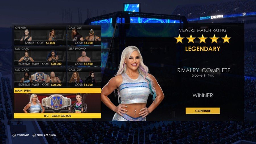 사용 가능한 레슬러 명단을 작성하고 자유 계약 선수와 계약할 수 있습니다. 당신의 임무는 가장 많은 시청자를 확보하기 위해 매주 최고의 경기를 펼치는 것입니다. 경기 예약 외에도 도움이 되는 다른 메커니즘이 있지만(자세한 내용은 아래 참조) 팬을 끌어들이는 주요 방법은 흥미진진한 경기를 예약하는 것입니다.