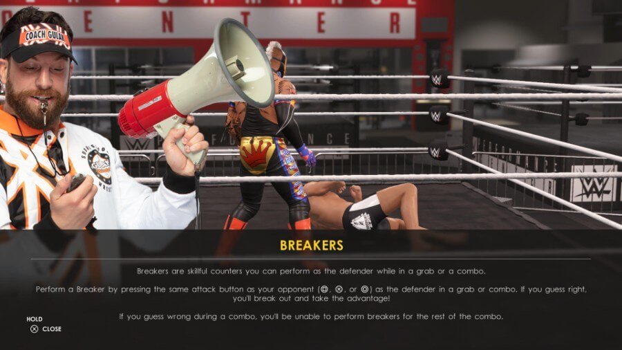 Riddle과의 경기에서 Performance Center에서 Rey Mysterio로 플레이하게 됩니다. 화면에 Gulak이 제공한 지침을 따르십시오. 그는 스트라이크와 콤보를 사용하여 가장 기본적인 기본 사항을 설명한 다음 콤보 브레이커 및 착륙 피니셔와 같은 고급 항목으로 안내합니다.